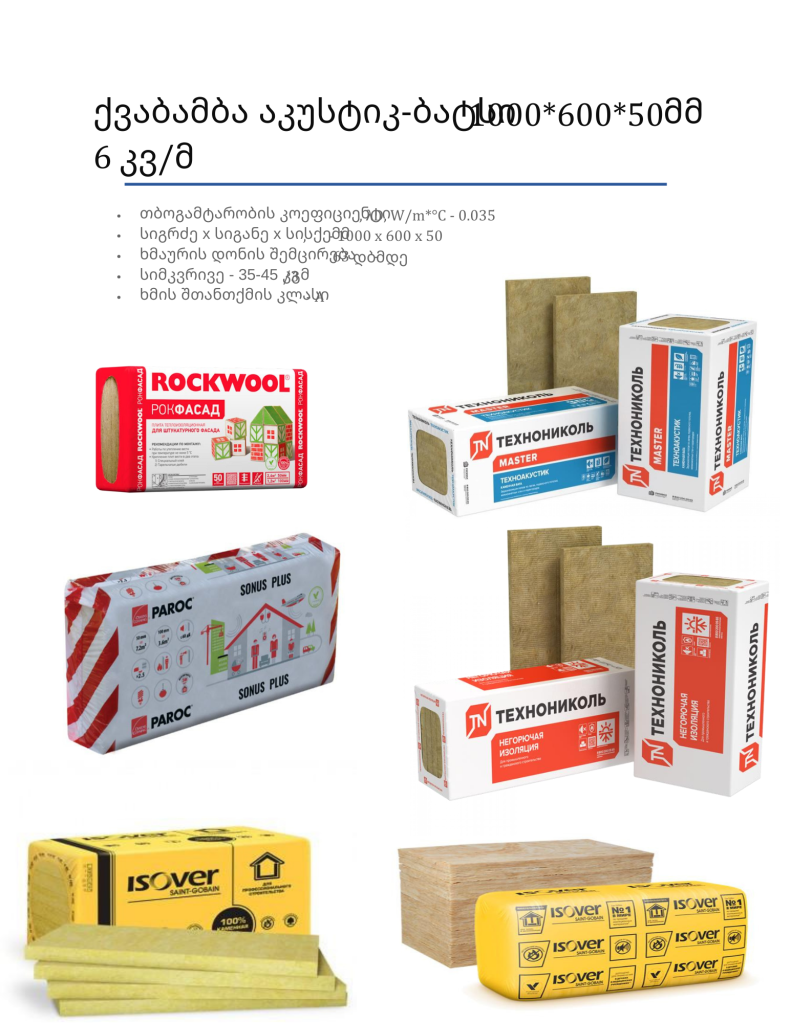 - მახასიათებლები: მინერალური ბამბა (როკვული ან მინის ბამბა) — ერთ-ერთი ყველაზე ძლიერი მასალა თბო-ხმის იზოლაციაში. გამოიყენება როგორც შიდა, ისე გარე კედლების თბოიზოლაციაში, გამოირჩევა მაღალი ხმის შთანთქმის უნარით და ცეცხლგამძლეობით.