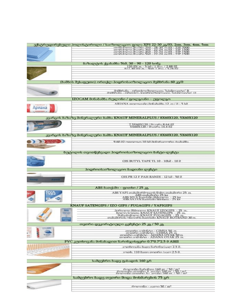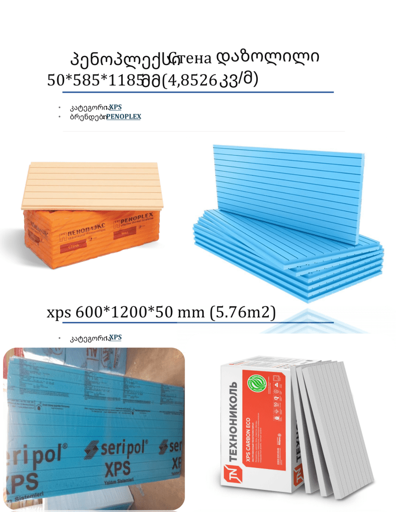 თბო-ხმის იზოლაციის მასალები — ქვაბამბა, პენოპლექსი, იპიესი და მინერალური ბამბა — ხშირად გამოიყენება სხვადასხვა შენობების თბოიზოლაციის და ხმის იზოლაციისთვის. აქ მოცემულია მათი ძირითადი მახასიათებლები, ზომები, დაპრესვები და ფასადის გამოყენებისთვის შემოღებული ინფორმაცია.