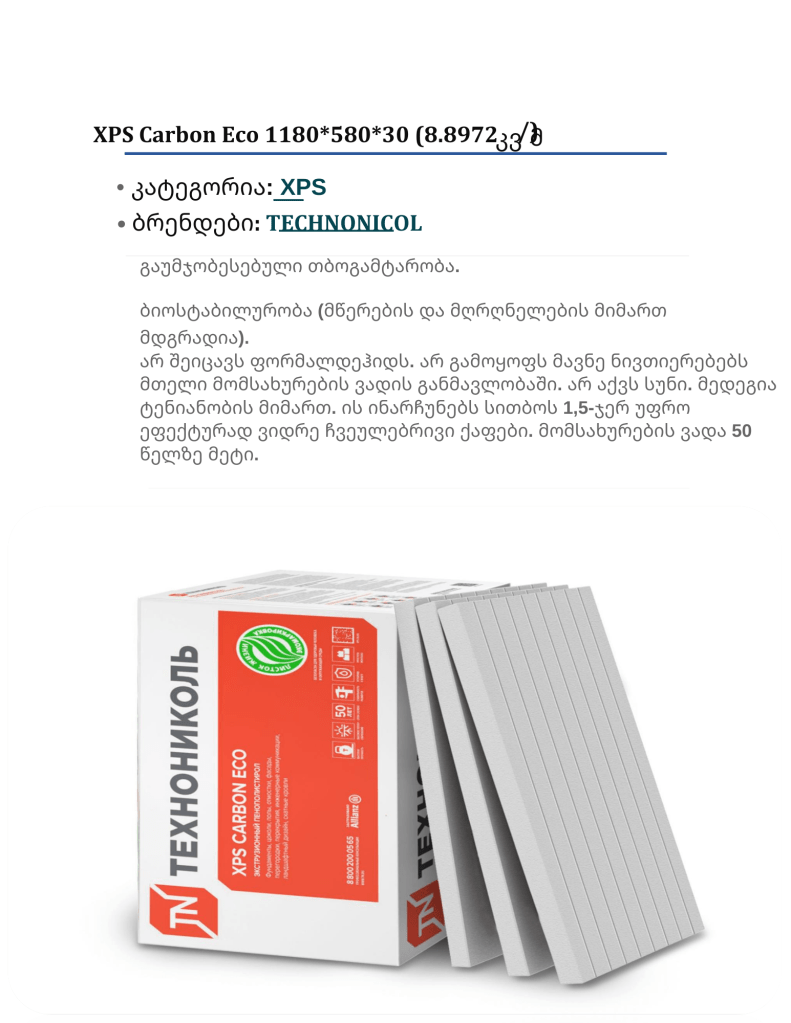 - გამოყენება: ძირითადად ფასადებს, სახურავებს და შიდა კედლების თბოიზოლაციაში გამოიყენება. წყალგაუმტარი და ცეცხლგამძლე.